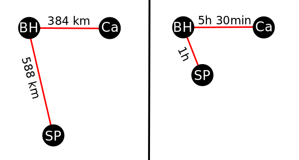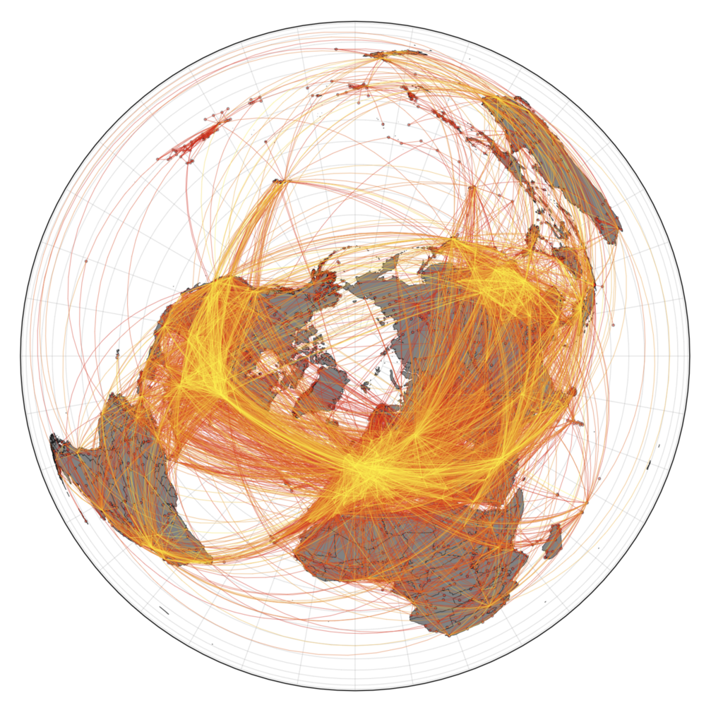 Na internet, o conceito de distância não faz muito sentido se você pensar bem. Gastamos o mesmo tempo enviando uma mensagem para alguém do nosso lado ou para uma pessoa no Japão. Esse nível de conexão mediada pela internet permite a propagação rápida e fácil de informação ao redor do mundo. Infelizmente, as dinâmicas de sistemas complexos e conectados também auxiliam na disseminação de vírus e outras coisas. Para enxergarmos o caminho que o vírus traça da China até os outros países, temos que esquecer o conceito de distância e pensar somente no tempo. Eu demoro 5h e 30min para ir de Belo Horizonte até a minha cidade natal, são 334km de carro. Porém, para ir a São Paulo eu levo só 1h indo de avião, de carro são 588km. Então, efetivamente, São Paulo está mais perto de Belo Horizonte do que minha cidade natal, apesar da grande diferença de quilômetros.