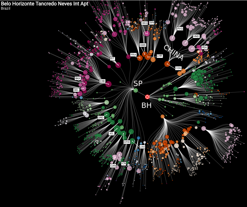 Essa distância efetiva nos deixa muito mais próximos de países como a China, Itália e EUA do que imaginamos. A figura abaixo foi feita por pesquisadores de Berlin, usando os dados de conexões de todos os aeroportos do mundo. Os lugares mais afastados no gráfico são mais difíceis de se chegar, porque temos que passar por mais aeroportos e leva mais tempo. Repare que para ir do Aeroporto de Confins (BH) até a China, só é necessário passar por dois lugares: Guarulhos (SP) e Paris (França). Olhando para a distância efetiva não estamos tão longe assim da China, na verdade é bem fácil ir pra lá.