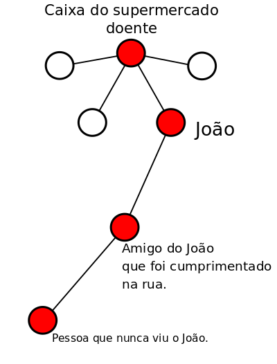 Um caixa de supermercado trabalhando doente é equivalente a um aeroporto com muitas conexões, pois consegue distribuir um vírus para centenas de pessoas que são atendidas diariamente. Inclusive, essa pessoa vai conseguir infectar gente que nem ao supermercado foi, como a figura abaixo mostra. Por isso, para conter a disseminação do vírus, é importante diminuir o contato com as pessoas e principalmente não ir trabalhar doente.