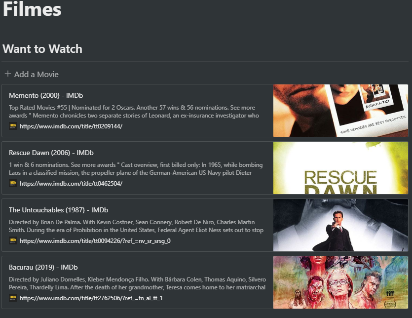 Nesse texto, eu só abordei uma pequena parcela do que pode ser feito no Notion. Um exemplo interessante, e que não foi abordado, são as páginas que já estão prontas no Notion, como a lista de filmes da imagem abaixo. Também é permitido que a comunidade crie e compartilhe páginas. Então, é fácil achar páginas bonitas e que possam atender suas necessidades.