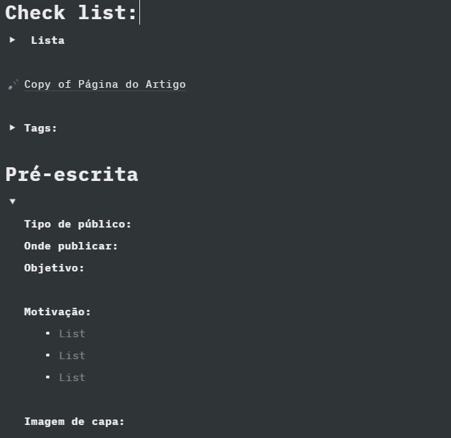 Além das páginas prontas, o Notion também permite que você padronize a criação de páginas. Por exemplo, se uma página tem a mesma estrutura e vai ser criada diversas vezes, não é necessário digitar toda a página novamente, é só criar uma página padrão. Essa página vai ser criada novamente toda vez que você clicar no botão dela. A imagem abaixo mostra a minha página de pré-escrita de artigos, como é sempre a mesma página eu criei uma página padronizada.