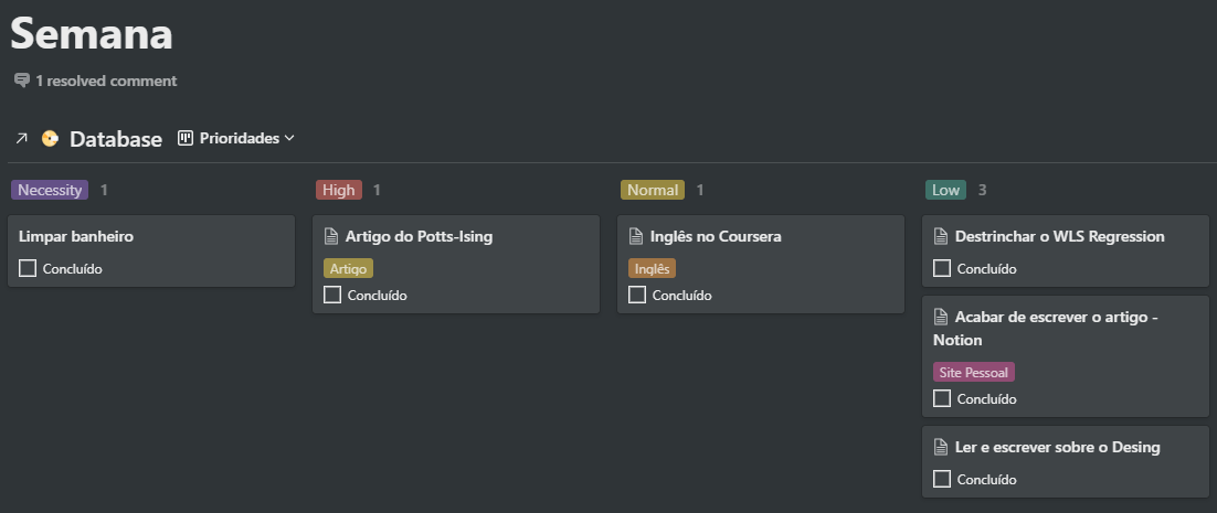 A primeira coisa que você precisa entender sobre o Notion são suas estruturas básicas; tudo o que é criado nele ou é uma página ou é um banco de dados. Vou usar como exemplo a minha lista de tarefas, imagem abaixo. Essa lista é na verdade um banco de dados, onde cada item possui algumas tags como nome, prioridade, projeto e uma caixa marcando se a tarefa já foi concluída ou não. Além disso, cada tarefa em si é uma página, onde podemos escrever um texto, adicionar imagens, GIFs entre outras coisas. A grande vantagem do Notion é que podemos manipular facilmente esse banco de dados e mudar a forma como os itens são visualizados.