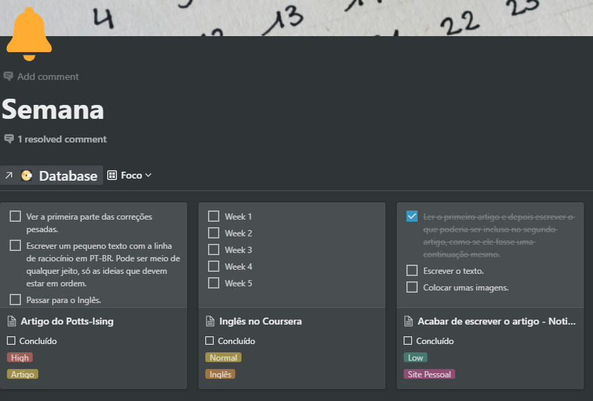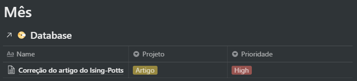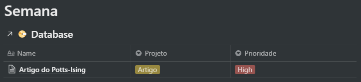 As páginas no Notion são muito versáteis, além de texto e imagens, também podem conter visualizações de banco de dados. Por exemplo, cada um dos meus projetos tem uma página própria que exibe toda a informação sobre ele, imagem abaixo. Nessa página, posso ver as tarefas relacionadas ao projeto que estão sendo feitas no mês e na semana, além de ter um espaço para fazer anotações. Mas o mais interessante, é que eu não preciso fazer nada para atualizar essa página. Como ela é só uma visualização de um banco de dados, toda vez que eu adicionar uma tarefa na lista da semana sobre o projeto, essa tarefa vai aparecer automaticamente na página do projeto. Dessa forma é fácil me organizar. O exemplo abaixo é o projeto de um artigo que estou escrevendo.